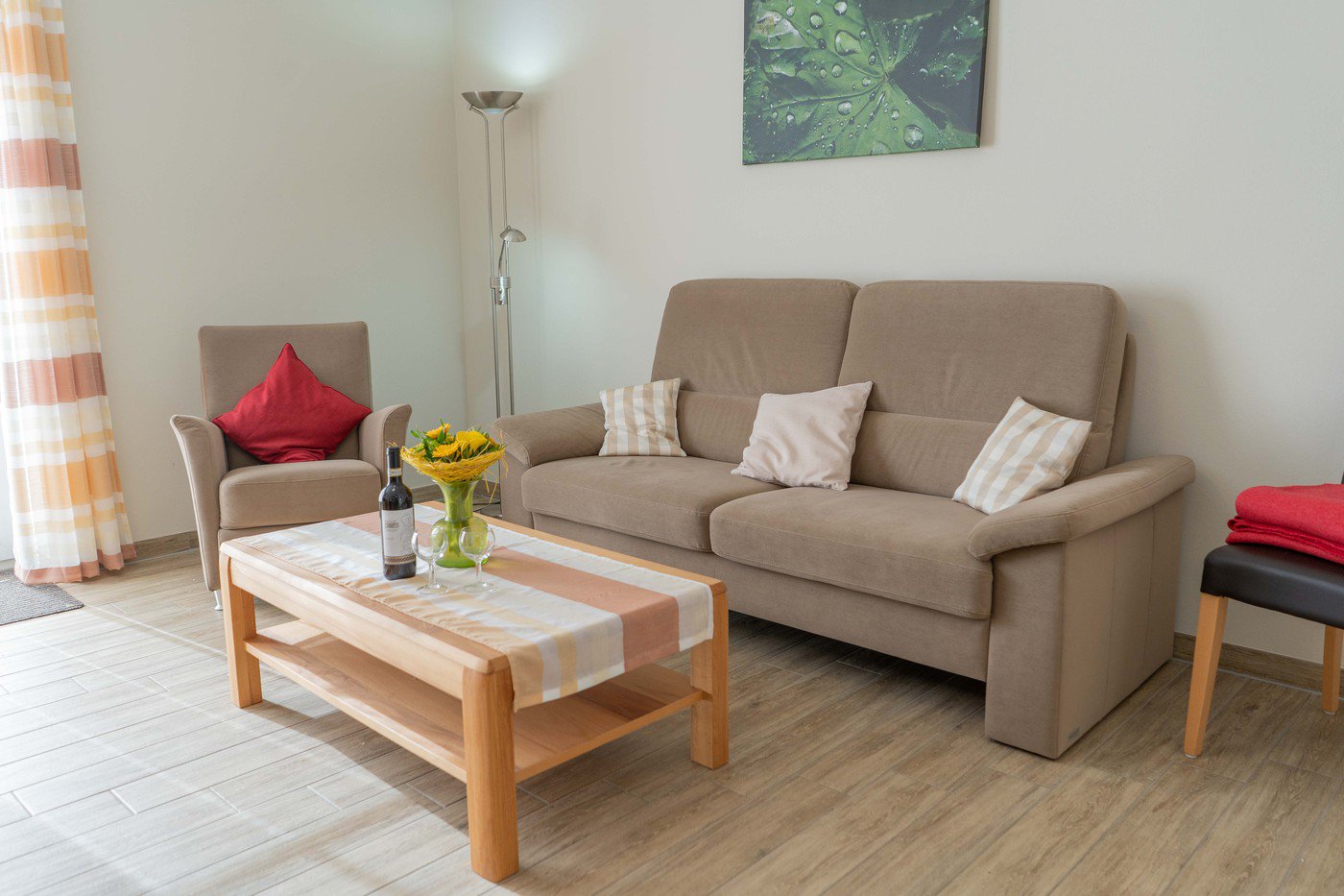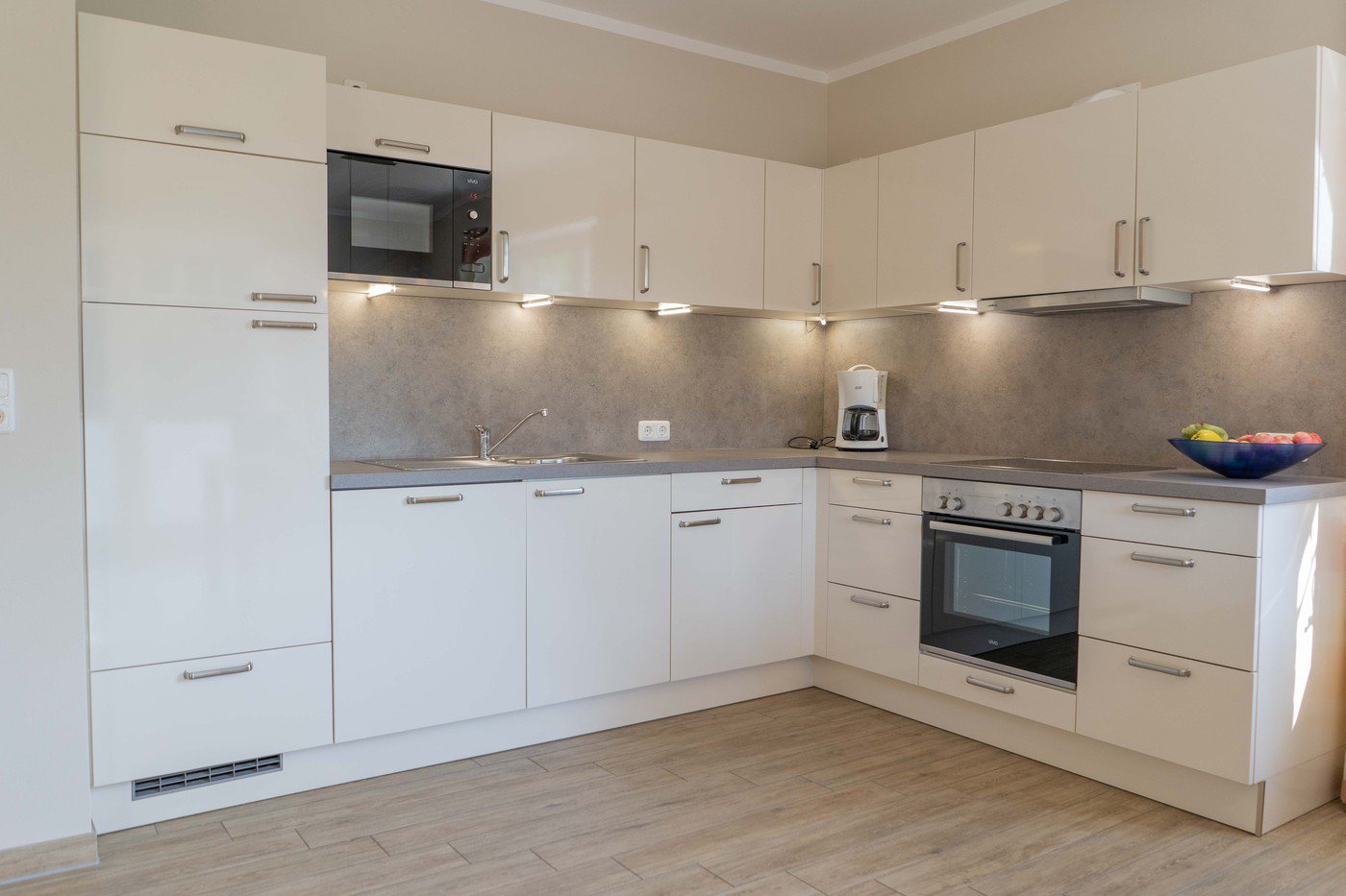 • Wohnraum mit Sitzgruppe und Essplatz, Flachbildfernseher, CD-Spieler, direkter Zugang zur Südterrasse, voll ausgestattete Küche, Herd mit Ceran-Kochfeld und Backofen, Mikrowelle, Geschirrspüler, Tiefkühlfach, Kaffeemaschine, Wasserkocher, Toaster usw.
