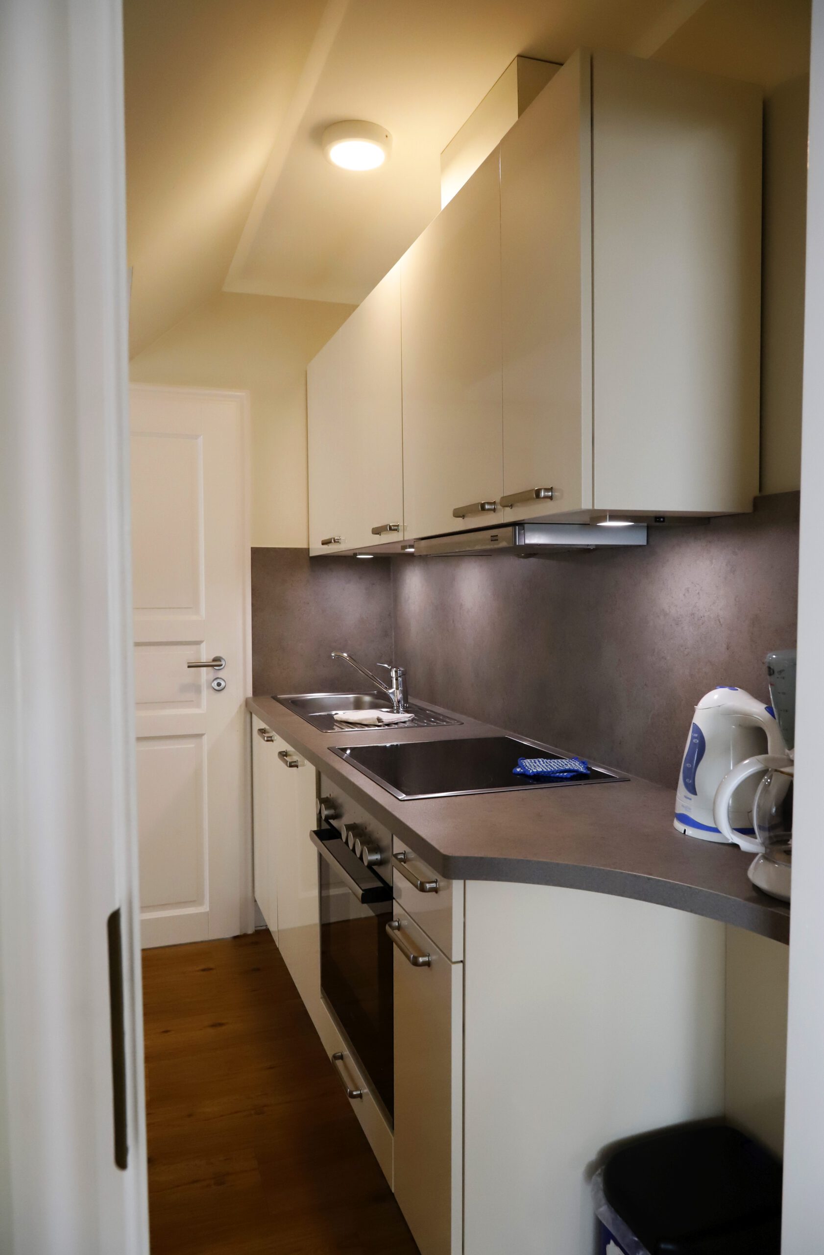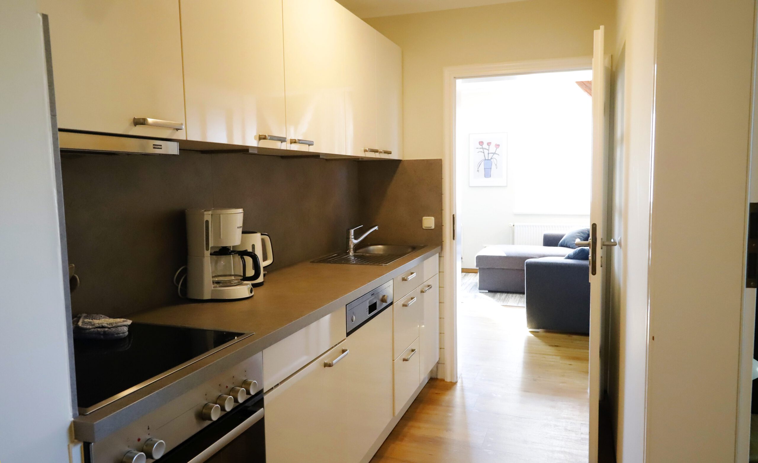 - separate Küche: komplett ausgestattet mit Ess- und Kochgeschirr, Herd mit Backofen, Kühlschrank mit Gefrierfach, Geschirrspüler, Kaffeemaschine, Wasserkocher, Toaster, usw.