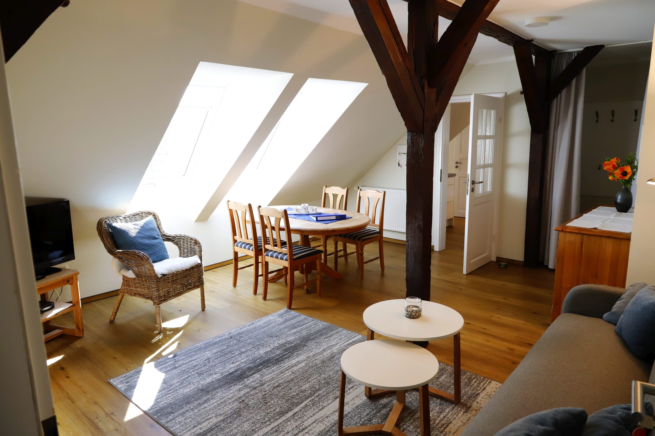 Diese Ferienwohnung befindet sich im Obergeschoss unseres schönen Bauernhauses und bietet auf 55 qm Platz für 1-5 Personen.