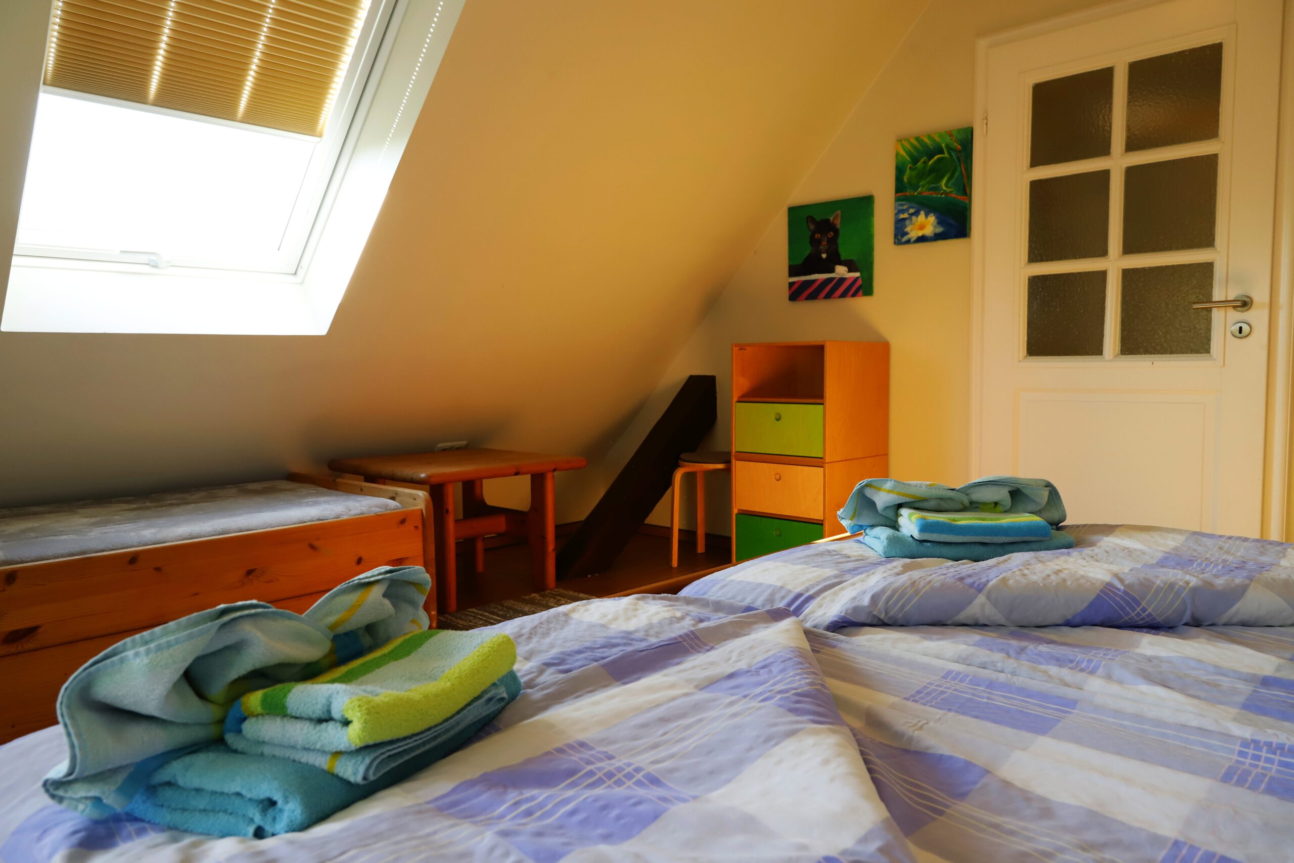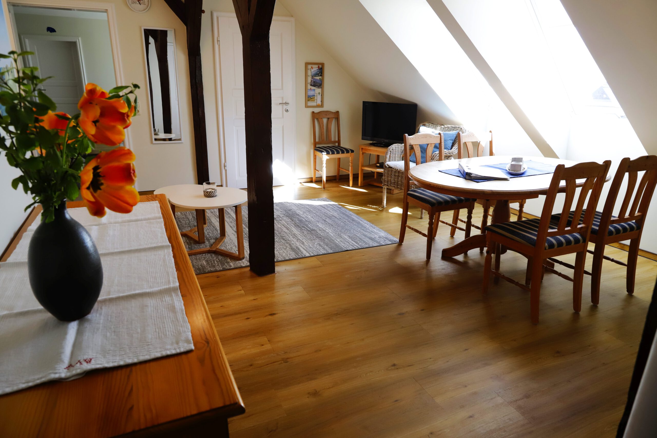 Diese Ferienwohnung befindet sich im Obergeschoss unseres schönen Bauernhauses und bietet auf 65 qm Platz für 1-5 Personen.