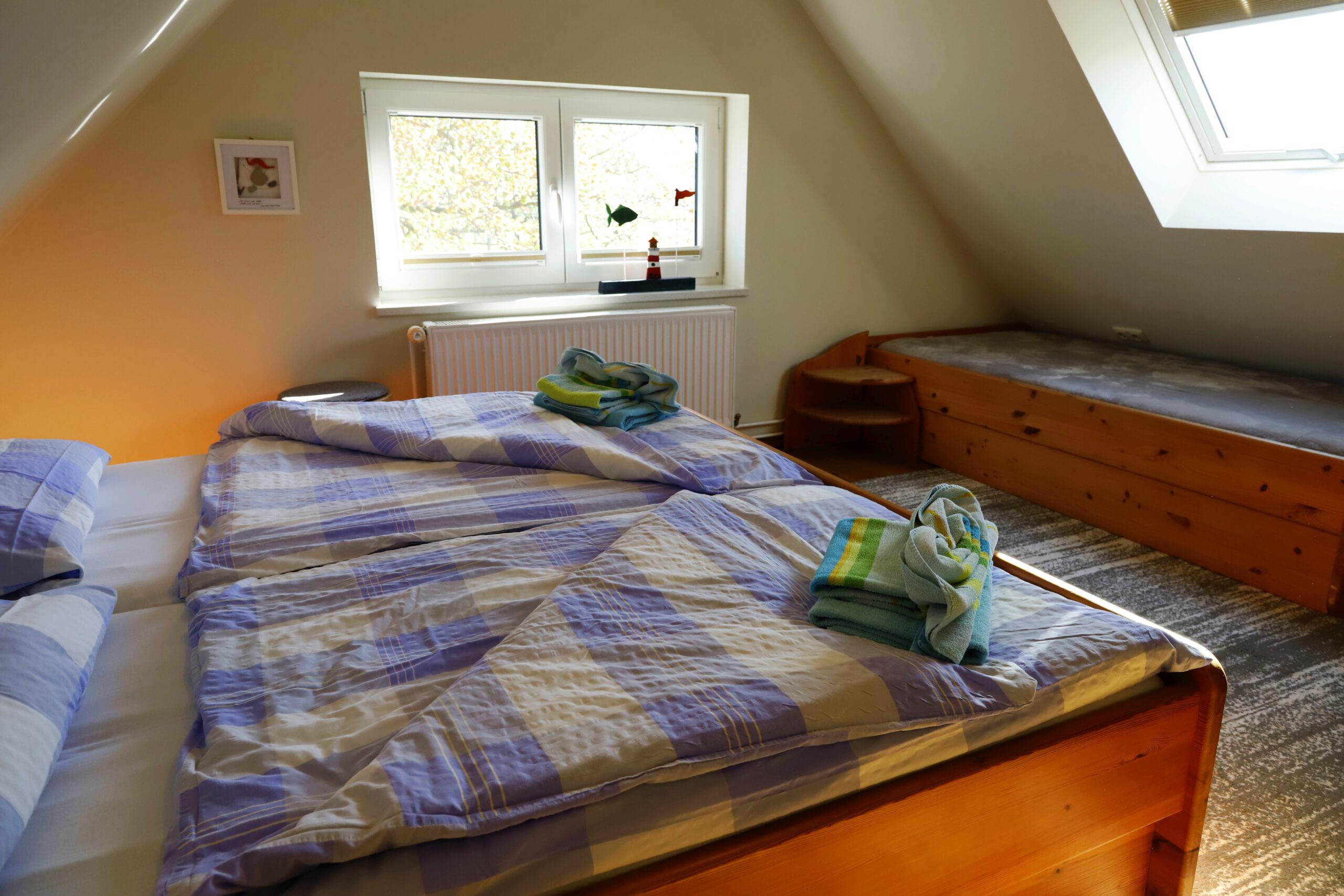 - in beiden Schlafzimmern befindet sich ein Doppelbett, eines hat zusätzlich ein Einzelbett; ausreichend Platz für ein Babybett ist vorhanden